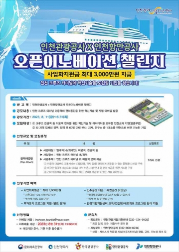 모집분야는 크루즈터미널 이용객을 위한 교통서비스 플랫폼, 안내 시스템, 편의 서비스 등이며, 관광 혁신기술 및 아이디어를 보유한 인천기업(이전 예정기업 포함)은 업종에 상관없이 지원할 수 있다.