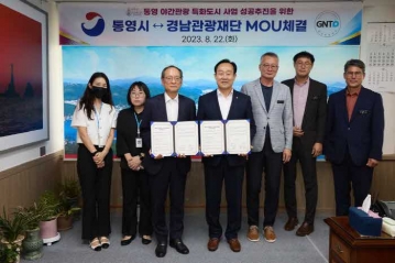 통영시(시장 천영기)와 경남관광재단(대표이사 황희곤)은 22일 시장실에서 지난해 9월 대한민국 제1호로 선정된 경남 통영 야간관광 특화도시 사업의 원활한 추진을 위한 업무협약을 체결했다.