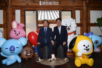 23일 유희태 완주군수와 우범기 전주시장은 전주한옥마을에서 진행되고 있는 <BT21 트립풀 전주완주> 출간 기념 ‘완전채(完全채)’ 팝업스토어에 함께 자리했다.