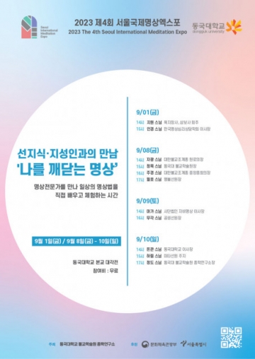 ‘제4회 서울국제명상엑스포’의 체험프로그램 ‘선지식·지성인과의 만남 - 나를 깨닫는 명상’을 9월 1일부터 22일까지 3주간 총 7일 동안 동국대학교 본교 대각전에서 개최한다.