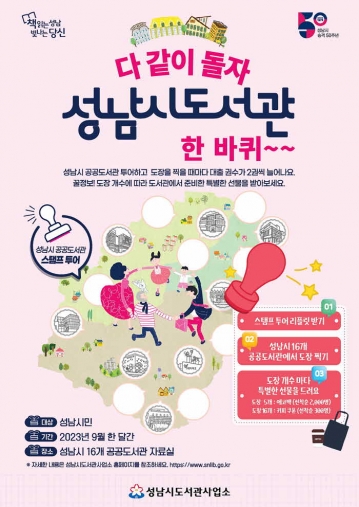 성남시는 독서의 달을 맞아 9월 한 달간 ‘다 같이 돌자 성남시 도서관 한 바퀴’ 스탬프 투어(도장 찍기 여행) 프로그램을 운영한다.