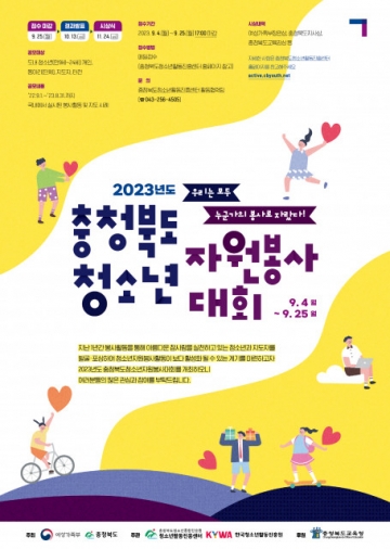 충청북도는 4일부터 여성가족부와 공동 주최하고, 충청북도청소년활동진흥센터와 한국청소년활동진흥원이 공동 주관하며, 충청북도교육청이 후원하는 ‘2023년도 충청북도청소년자원봉사대회’의 봉사활동 우수사례 접수를 시작한다고 밝혔다.