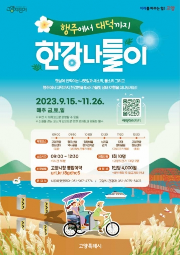 ‘행주에서 대덕까지, 한강 나들이’는 9월 15일부터 11월 26일까지 매주 금, 토, 일요일에 진행된다. 관광 코스는 고양관광정보센터에서 출발하여 행주산성역사공원, 고양대덕생태공원까지 이어진다.