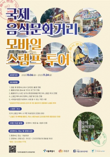 서울신용보증재단 구로지점은 골목상권 활성화를 위해 10월 6일부터 11월 24일까지 구로구 국제음식문화거리를 방문하는 주민 및 관광객을 대상으로 ‘O2O(Online To Offline) 이벤트 : 모바일 스탬프투어’를 진행한다고 밝혔다.