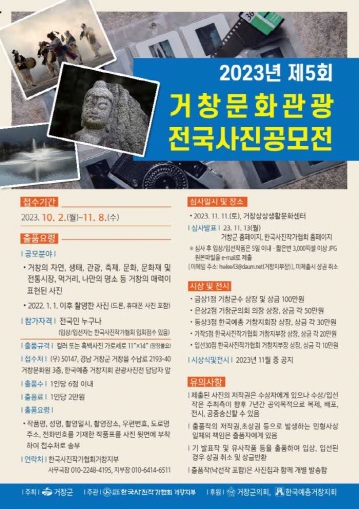 한편, ‘제5회 거창문화관광 전국사진공모전’과 관련된 접수방법과 제출서류 등 기타 자세한 사항은 거창군 문화관광 홈페이지를 확인하거나 (사)한국사진작가협회 거창지부(사무국장 010-2248-4195)로 문의하면 된다.