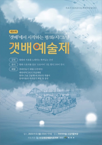 속초민예총(회장 박용민)의 제10회 갯배예술제가 오는 11월 12일(일) 오후 1시부터 청호동 오징어할복장에서 개최된다.
