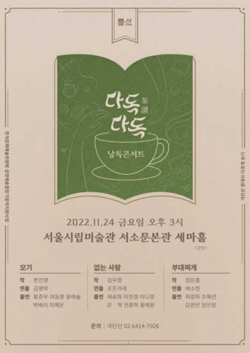 [다독다독 낭독콘서트]는 ‘차를 마시며 글을 읽는다’는 뜻의 ‘다독(茶讀)’과 ‘위로하다’의 의미인 ‘다독이다’