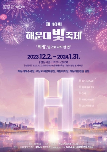 해운대구(구청장 김성수)는 12월 2일부터 내년 1월 31일까지 ‘희망, 빛으로 다시 한번’을 주제로 ‘제10회 해운대 빛축제’를 개최한다.
