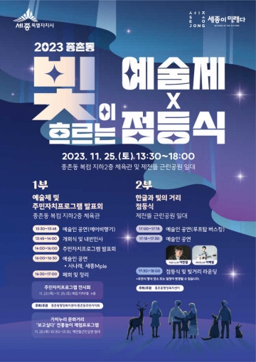 세종특별자치시 종촌동(동장 표순필)이 오는 25일 ‘2023 종촌동 빛이 흐르는 예술제 및 점등식’을 개최한다.