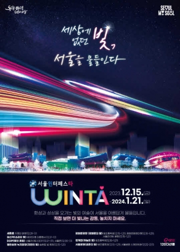<서울윈타(서울윈터페스타) 2023>(이하 서울윈타)는 서울 대표 매력포인트 7곳(DDP~보신각~세종대로~광화문광장~열린송현녹지광장~청계천~서울광장)에서 펼쳐지는 10개 축제·행사를 하나로 이은 초대형 도심 겨울축제다. 이번 축제는 ‘세상에 없던 빛, 서울을 물들인다’는 슬로건 아래 ‘빛’을 공통 소재로 하여 ’23.12.15.(금)~’24.1.21.(일)까지 38일간 미디어아트, 빛 전시 등을 통해 서울의 겨울밤을 화려한 빛의 향연으로 물들인다.
