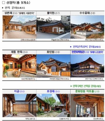 올해 새롭게 추가된 <한옥건축양식> 분야에서는 ▴호경재(종로) ▴지금(종로) ▴한문화체험관(은평) 총 3개소가, <한옥디자인 건축물> 분야에서는 ▴문화정원 아트홀(금천) 1개소가 선정됐다.