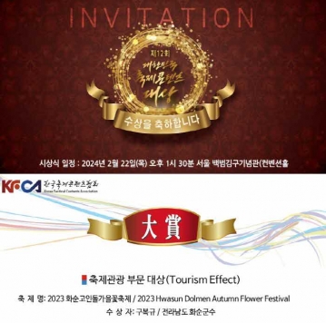 화순군(군수 구복규)이 (사)한국축제콘텐츠협회가 주최하는 제12회 대한민국축제콘텐츠대상에서 축제 관광 부문 대상 수상의 쾌거를 달성했다.