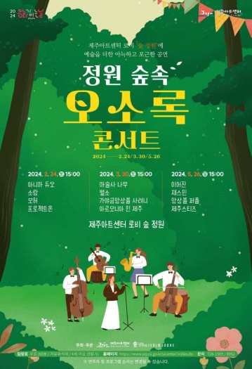 제주아트센터는 문화가 있는 날 행사로 올해 상반기 중 3회에 걸쳐 진행되는 <정원 숲속 오소록 콘서트>의 첫 공연을 2월 24일(토) 오후 3시에 개최한다.