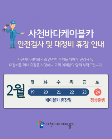 사천바다케이블카는 대정비 기간 동안 대방·초양·각산정류장 안전점검을 비롯해 비파괴검사(NDT), 브레이크, 지주 등에 대한 안전상태도 일제히 점검한다.