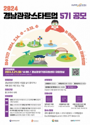 경남도는 경남관광재단과 함께 경남관광의 미래를 선도할 ‘경남관광스타트업 5기’를 3월 13일까지 공개 모집한다고 밝혔다. 경남관광스타트업은 전통적인 관광 분야부터 정보통신 기술과 관광을 접목한 융복합 분야를 전체적으로 아우르는 관광 관련 창업 기업이다.