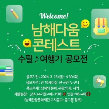 남해 여행기 뿐아니라 남해군의 역사·문화 자원을 소재로 한 글이면 응모 가능하다. 총 11편의 원고를 선정해 추후 인쇄물로 발간할 예정이다.