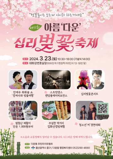 이와 함께 △벚꽃 풍선아트·인생네컷·손 그림 그리기(핸드 페인팅) △달고나·떡메치기·드립 커피 체험 △입화산 참살이숲 야영장 체험 △벚꽃 산책길 장터(프리마켓) △꽃놀이 음식장터 등 다양한 체험 및 부대행사 등이 운영된다.