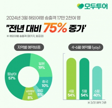 3월의 해외 패키지 예약건수는 98,840명, 항공권은 73,250명으로 전년 동기 대비 각 58%, 105% 증가했다.