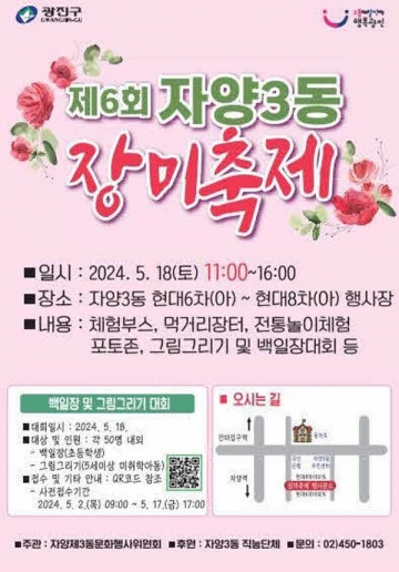 자양제3동문화행사위원회(위원장 장국환)가 주관하는 자양3동 장미축제는 장미를 활용한 특색 있는 축제 운영으로 많은 구민이 찾는 지역 대표축제이다. 지난해에는 약 2천여 명의 인원이 방문할 만큼, 매년 큰 사랑을 받고 있다.