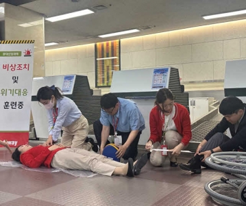 특히 이번 점검에서는 사업장 중대재해 발생을 대비하기 위해 위험성평가를 기반으로 한 가상 시나리오를 바탕으로 비상대응 훈련을 실시하였다. 설정한 시나리오는 컨베이어 벨트 수하물 처리 중 사고 발생과 그에 따른 부상자 발생 대응으로 상황 발생부터 구호조치 과정, 환자 후송과 보고체계, 안전보건관리책임자의 훈련 강평 및 보건관리자의 응급처치(AED 사용법, CPR 방법) 교육까지 순차적으로 진행하였다.