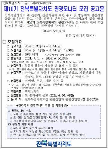 전북특별자치도는 도내 관광서비스 질을 향상에 앞장설 제10기 관광모니터 요원을 오는 14일까지 모집한다고 3일 밝혔다.