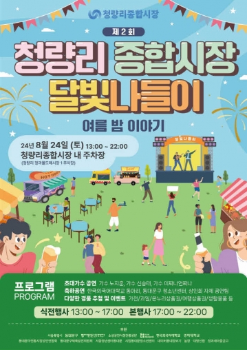 서울 동대문구(구청장 이필형)는 오는 8월 24일(토) 오후 1시부터 10시까지 청량리종합시장 내 주차장에서 제2회 ‘청량리종합시장 달빛나들이’ 축제가 열린다고 밝혔다. 이번 축제는 청량리 전통시장을 활성화하고, 지역 주민들과 다양한 세대가 함께 즐길 수 있는 문화예술의 장을 마련하기 위해 기획되었다.