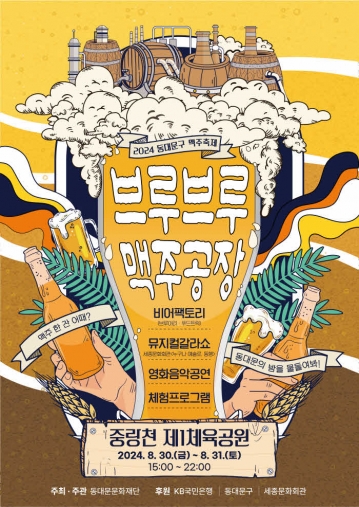 서울 동대문구가 여름의 끝자락을 수제 맥주와 문화공연으로 풍성하게 채울 예정이다. 동대문구(구청장 이필형)는 8월 30일(금)부터 31일(토)까지 중랑천 제1체육공원에서 ‘2024 동대문구 맥주축제, 브루브루 맥주공장’을 개최한다고 밝혔다.