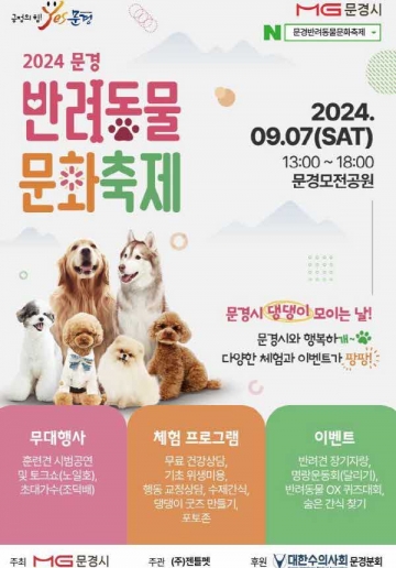 먼저, 7일에는 문경시 모전공원에서 ‘문경 반려동물 문화축제’를 개최하며 훈련견 시범 공연, 펫티켓 퀴즈대회, 수의사 무료 동물등록, 문제행동 교정 및 상담, 체험행사(수제 간식 만들기, 액세서리 만들기) 등 다양한 볼거리와 즐길 거리를 마련했다.