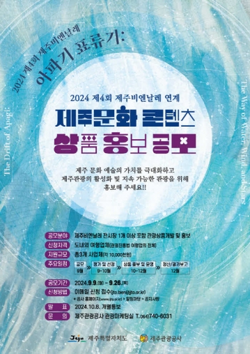 제주특별자치도와 제주관광공사(사장 고승철)는 오는 9월 27일까지 온라인 채널을 통해 국내 여행업계를 대상으로 『2024 제4회 제주비엔날레 연계 제주 문화콘텐츠 상품 홍보』 사업에 참여할 업체를 모집하고 있다고 9일 밝혔다. 이번 공모는 제주비엔날레와 연계한 관광상품을 개발해 제주 문화 콘텐츠의 가치를 부각시키고, 제주 관광의 매력을 한층 더 높이기 위한 목적으로 기획됐다.