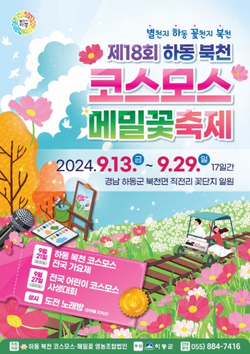 하동군은 코스모스·메밀꽃이 아름답게 수놓은 북천면의 드넓은 들판에서 오는 13일부터 ‘제18회 하동 북천 코스모스·메밀꽃 축제’가 개최된다고 밝혔다.