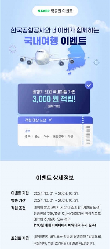 한국공항공사(사장직무대행 이정기)는 가을 여행철을 맞아 10월 한 달 간 네이버항공권 홈페이지를 통해 국내선 항공권을 구매하면 네이버페이 포인트를 적립해주는 프로모션을 실시한다.