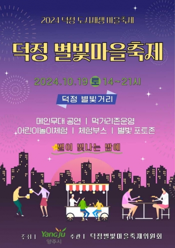 양주시(시장 강수현)는 오는 10월 19일 덕정역 앞 덕정 별빛거리 일원에서 ‘2024 덕정 별빛마을축제’를 개최한다고 밝혔다. 이번 축제는 덕정 도시재생사업의 일환으로, 지역 상권을 활성화하고 지속 가능한 축제 모델을 구축하기 위해 기획되었다. 특히, 주민참여형 축제로서, 지역 주민들로 구성된 축제위원회가 직접 축제를 주관하며, 지역 사회와의 협력을 통한 도시재생 마을축제를 실현하고자 한다.