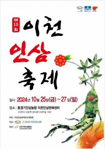 이천시(시장 김경희)는 올해로 10회를 맞이하는 ‘이천인삼축제’를 오는 10월 25일부터 27일까지 3일간 이천인삼판매센터(신둔면 둔터로124번길 160) 일원에서 개최한다고 밝혔다.