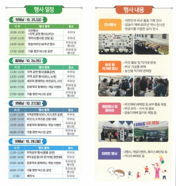 이번 축제는 10월 25일 개막식을 시작으로 양송이재배 60주년 행사, 대한민국 버섯 품목 기획전시, 버섯을 이용한 요리 전시 등을 준비했다. 또한 신선한 버섯을 맛보고, 사 갈 수 있는 농산물 직거래 판매장과 버섯을 이용한 가공품 판매 및 시식 코너 등이 운영된다.