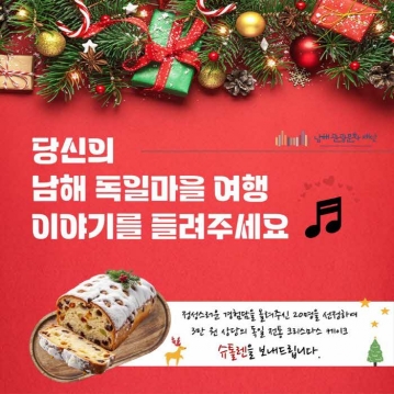 지금 당장 남해를 방문하지 않아도 누구나 참여할 수 있다. 남해 독일마을 여행사진이나 영상을 필수 태그 5개와 함께 업로드 하면 된다. 이번 이벤트는 남해 독일마을 여행추억을 소환해 다시 남해로 가고 싶은 마음을 불러 일으키기 위해 추진된다. 20명을 선정해 3만원 상당의 독일 크리스마스 간식을 증정할 예정이다.