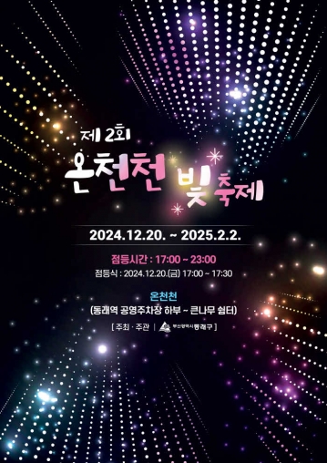 장준용 동래구청장은 “온천천 빛 축제는 추운 겨울 속에서도 따뜻함과 낭만을 선사하는 공간”이라며 “가족, 연인, 친구들과 함께 온천천의 아름다운 빛을 즐기며 특별한 추억을 만들어가길 바란다”고 전했다.