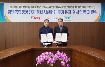 티웨이항공이 인천국제공항공사와 함께 지난달 30일(월) 인천국제공항공사 청사에서 ‘인천국제공항 첨단복합항공단지 항공기 정비시설(H2) 개발사업’에 대한 실시 협약식을 진행했다고 밝혔다.