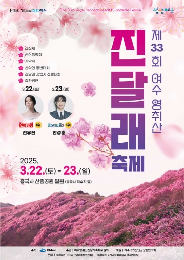 전국 3대 진달래 군락지로 알려진 영취산과 흥국사 산림공원 주 무대 일원에서 오는 22일부터 23일까지 ‘제33회 여수영취산진달래축제’가 개최된다.