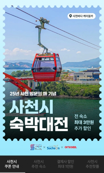 사천시(시장 박동식)는 2025 사천방문의 해를 맞아 체류형 관광 활성화를 위해 국내 최대 OTA(온라인 여행사)인 야놀자 플랫폼, 여기어때와 협업으로 ‘사천에 또와! 사천 숙박대전’을 진행한다고 24일 밝혔다.