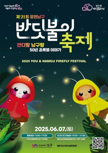 부산 남구(구청장 오은택)는 오는 6월 7일 토요일, 평화공원과 이기대 큰고개쉼터 일대에서 ‘제21회 유엔남구 반딧불이 축제’를 개최한다. 올해 축제는 남구청 개청 50주년을 맞아 ‘반디랑 남구랑 50년 초록별이야기’를 주제로 열리며, 반딧불이와 함께 걸어온 남구의 지난 시간과 앞으로의 지속 가능한 미래를 조명하는 의미 있는 자리로 마련됐다.