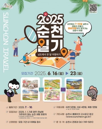 순천시(시장 노관규)는 지역의 일상과 감성을 체험하는 체류형 관광 프로그램 「2025 순천일기」 참가자를 오는 16일부터 23일까지 공개 모집한다고 밝혔다.