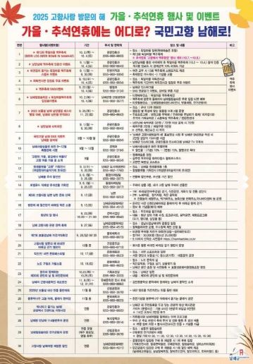 추석과 가을철을 맞아 남해군 곳곳에서는 크고 작은 행사들이 이어진다. 군민의 날 및 화전문화제를 비롯해 국민고향 남해 SNS 이벤트, 남해사랑상품권 화전 특별판매, 남해몰 추석 할인전, 낭만남해 숙박대전, 낭만캠핑 페스타 등 관광객과 지역민이 함께 참여할 수 있는 행사가 다채롭게 펼쳐진다. 또한 창생플랫폼 ‘고향’ 기획전시, 자전거 대축전, 남해힐링숲타운 이벤트, 고향사랑 관광 정책 축제 등이 열려 전 세대와 취향을 아우르는 풍성한 프로그램이 준비돼 있다.
