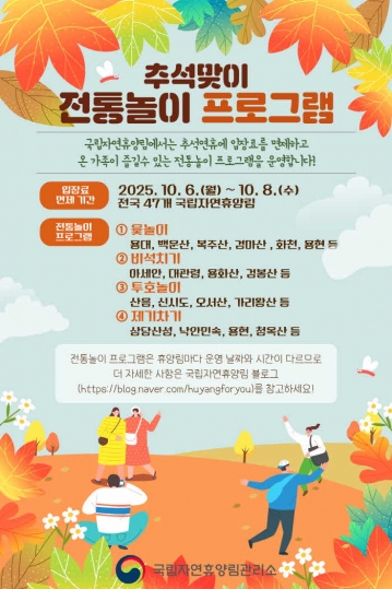 휴양림별로는 윷놀이, 제기차기, 투호 던지기, 팽이치기 등 전통놀이 프로그램이 진행되며, 어린이들에게는 한국의 전통문화를 배우는 생생한 교육의 시간이 되고, 어른들에게는 추억을 되새기는 뜻깊은 시간이 될 것으로 기대된다. 일부 휴양림에서는 숲 해설사와 함께하는 자연탐방 프로그램과 ‘가을숲 생태놀이 교실’도 운영돼 교육과 체험을 겸한 가족형 휴양지로 주목받고 있다.