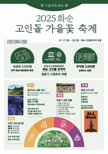 전남 화순군(군수 구복규)은 오는 10월 17일부터 26일까지 10일간 유네스코 세계문화유산인 화순 고인돌 유적지 일대(춘양면 대신리, 도곡면 효산리)에서 ‘가을만화(滿花)’를 주제로 한 「2025 화순 고인돌 가을꽃 축제」를 개최한다고 밝혔다.