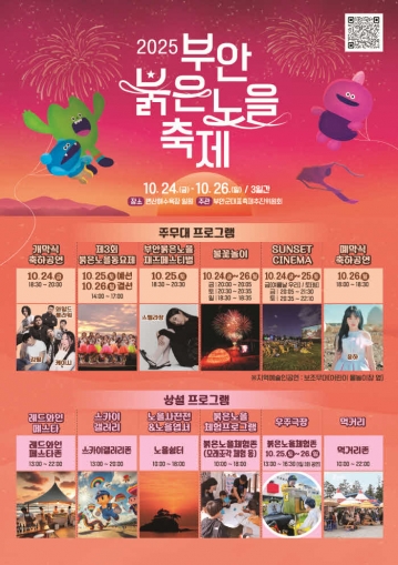 ‘2025 부안붉은노을축제’는 자연과 예술, 낭만이 함께하는 부안의 대표 가을 축제로, 변산해변의 붉은 석양 아래 펼쳐질 특별한 3일간의 힐링 여행을 예고하고 있다.