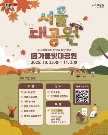 서울대공원이 가을 정취를 만끽할 수 있는 특별한 축제를 마련했다. 서울시는 오는 10월 25일(토)부터 11월 2일(일)까지 9일간, 서울대공원 일대에서 ‘2025 가을단풍축제–가을빛대공원’을 개최한다고 밝혔다. 공원 전체가 오색 단풍으로 물드는 이 시기, 가족·연인·친구와 함께 도심 속에서 가을의 아름다움을 즐길 수 있는 절호의 기회다.