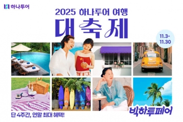 (주)하나투어(대표이사 송미선)가 겨울 방학과 연말연초 여행객을 위해 다양한 상품과 혜택을 한자리에 모은 ‘2025 하나투어 여행 대축제, 빅하투페어’를 오는 30일까지 진행한다.