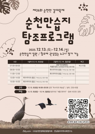 축제 프로그램 역시 겨울철새의 생태를 깊이 이해할 수 있도록 구성됐다. 조류 전문가와 함께하는 심화 탐조 프로그램 ‘특별한 탐조’, 겨울 순천만의 대표종인 흑두루미를 주제로 한 해설 프로그램 ‘흑두루미와 춤을’, 인간과 독수리의 공존을 조명하는 특별 강연 ‘독수리의 하늘길’ 등이 포함돼 탐방객들에게 교육적이면서도 흥미로운 경험을 제공한다.