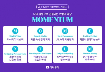 2026년 하나투어 여행 트렌드 키워드인 ‘M.O.M.E.N.T.U.M.’은 나를 중심으로 한 선택과 행동이 여행의 각 분야(AI, 취향, 관계, 소비 등)와 연결되고 확장된다는 점에 착안해 선정했으며, ▲의식적 가치 소비(Mindful Value) ▲자연 속 생명력 회복(Organic Vitality) ▲AI, 여행의 동반자(My AI Companion) ▲기분이 좋아지는 소비(Exciting Feeling) ▲취향 기반의 나다운 여행(Navigating Personal Taste) ▲여행에서의 새로운 만남(Traveling with New People) ▲ 나만의 이야기가 있는 여행(Unique Storytelling) ▲순간을 붙잡는 즉흥 여행(Moment Seizing)을 의미한다.