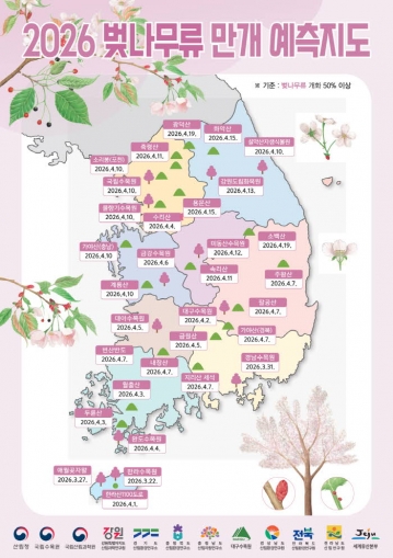 산림청이 2026년 봄철 꽃나무 개화 예측지도를 발표하고 올해 봄꽃 개화 시기가 지난해보다 다소 앞당겨질 것으로 전망했다.
